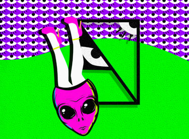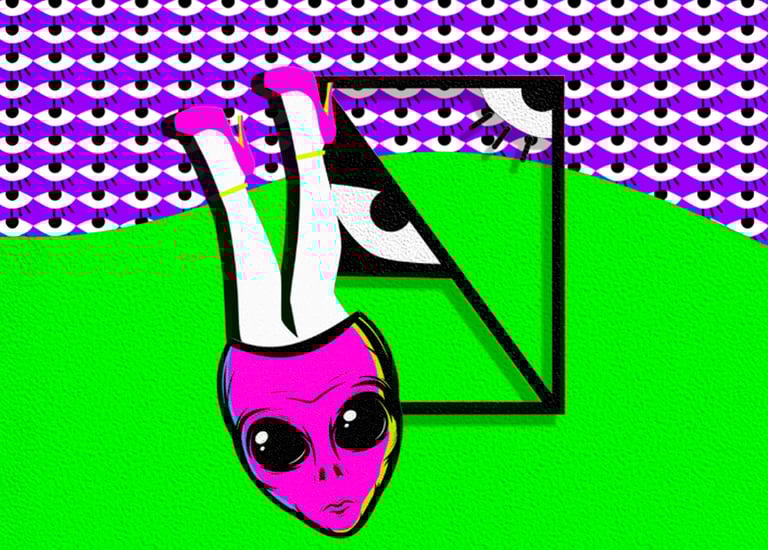 Conceito visual vibrante e surrealista para marca inglesa, unindo estética alienígena e moda urbana em colagens pop.