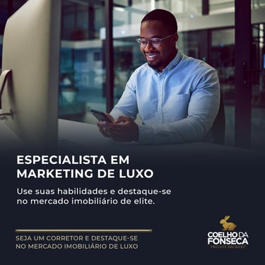 As chamadas e CTAs (“Seja um corretor e destaque-se no mercado imobiliário de luxo”) foram otimizadas para conversão, respeitando o tom refinado e inspirador da marca.